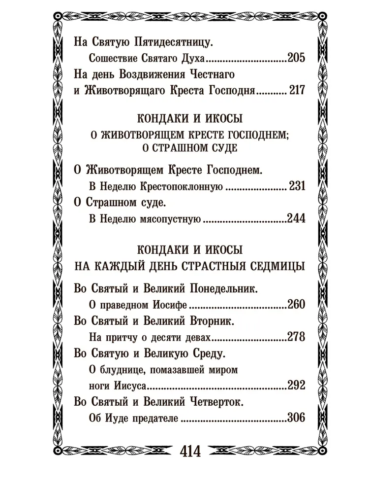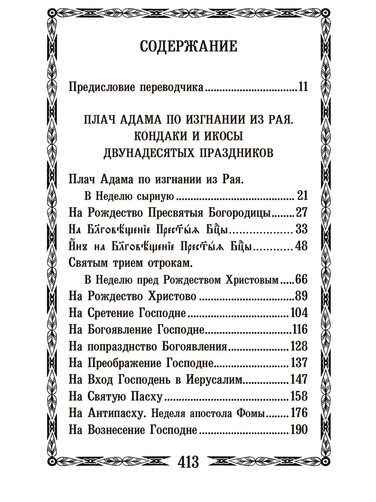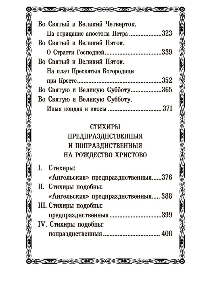 Для этого издания избрано 27 кондаков, распределенных в 3 раздела: I. Двунадесятым праздникам; II. О Животворящем Кресте Господнем, О Страшном Суде; III. На каждый день Страстной седмицы. В IV раздел вошли все его 98 стихир на Рождество Христово.
