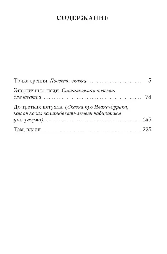 В настоящую книгу вошли сатирическая повесть для театра «Энергичные люди», повести-сказки «Точка зрения» и «До третьих петухов», а также повесть «Там, вдали».