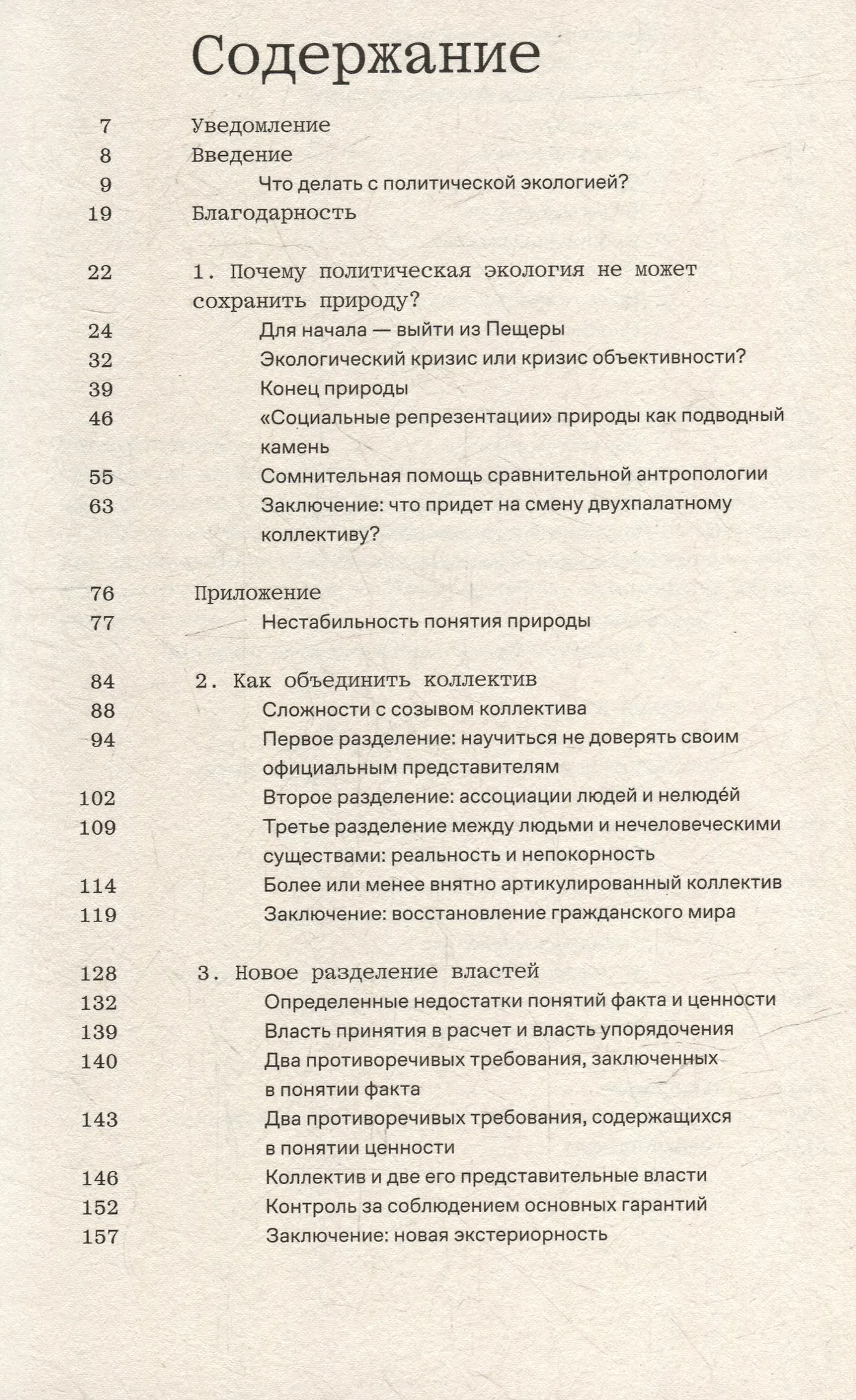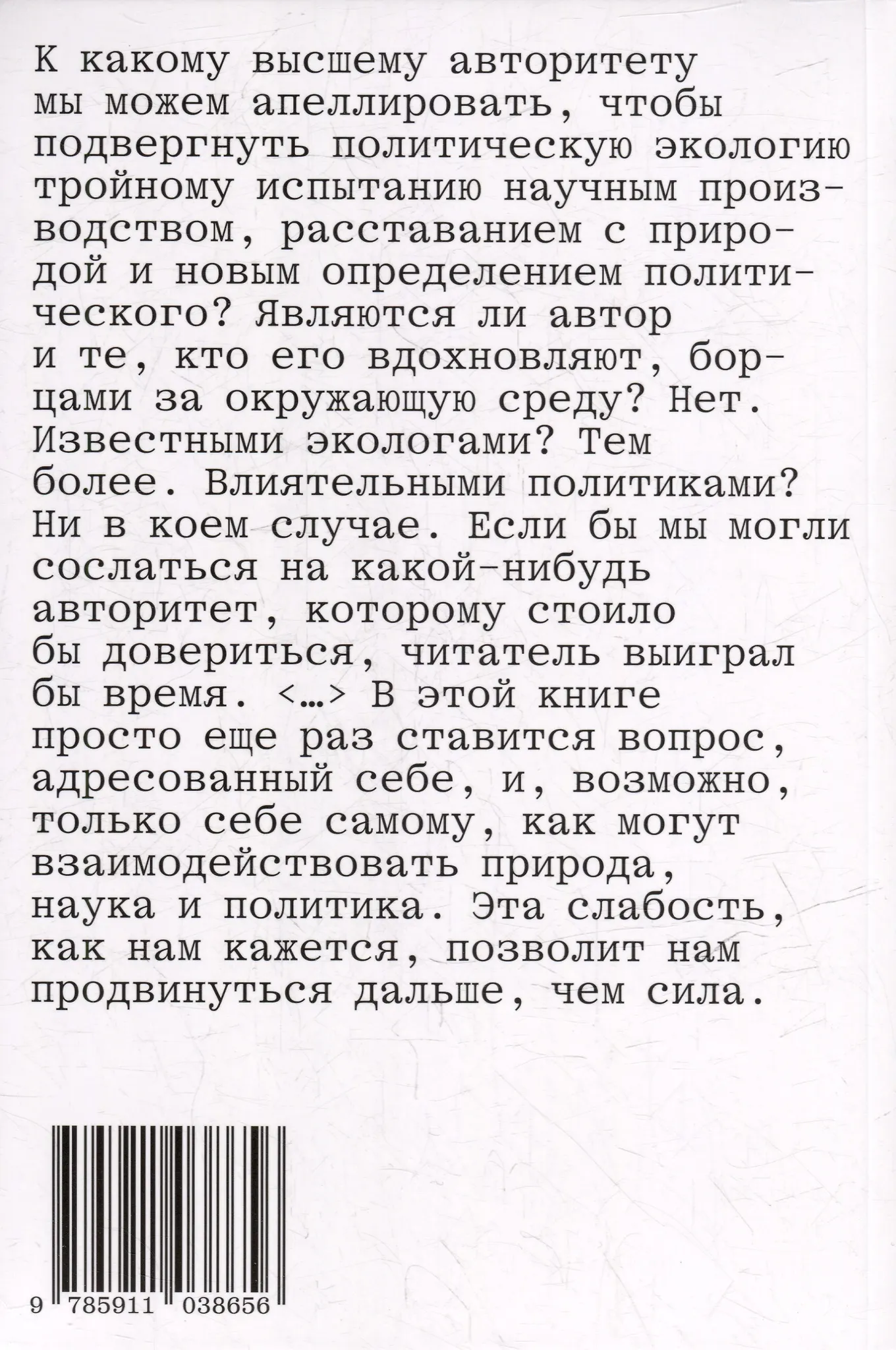 В книге французского философа и социолога Бруно Латура развивается оригинальный проект «экспериментальной метафизики». Ее главной целью является выработка новой концепции политической экологии, которая позволила бы совместить научные практики с демократическим процессом принятия решений, что требует одновременного пересмотра трех фундаментальных для западной философии понятий логоса, фюсиса и полиса.