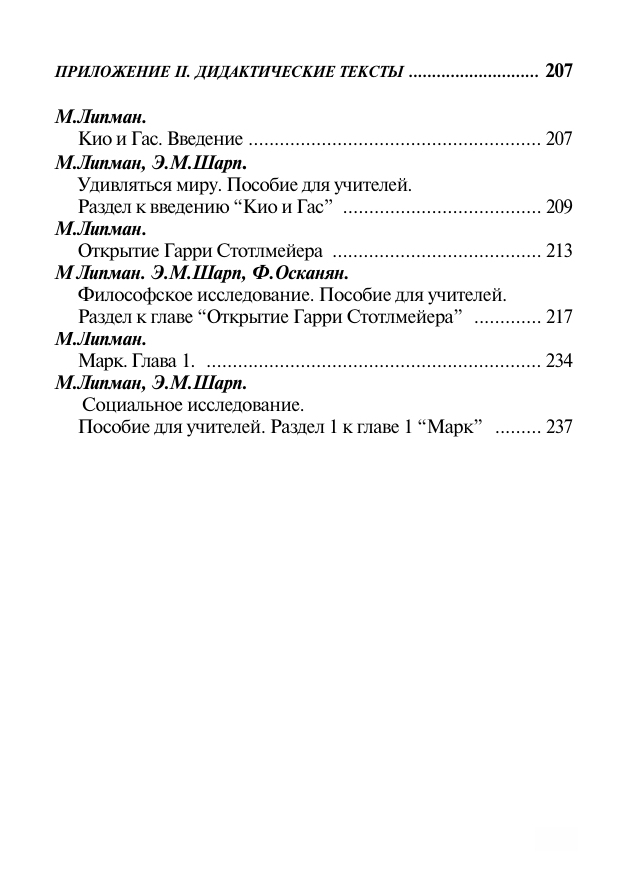 В 1972 году Липман покинул Колумбийский университет и перешёл в Государственный колледж Монтклер, где в 1974 году вместе с Энн Маргарет Шарп основал Институт содействия развитию философии для детей (IAPC). Липман изобрёл жанр учебного философского романа для детей, начиная с «Открытия» Гарри Стоттлмайера, которое он тестировал в школах Монтклера и Ньюарка. Липман написал серию из девяти философских романов для начальных и старших классов, каждый из которых содержал учебные пособия. Липман и Шарп теоретизировали «сообщество философского исследования» как протокол детской философской практики и проводили курсы и мастер-классы по профессиональному развитию по этому протоколу для философов и учителей по всему миру. Основал журнал Thinking: The Journal of Philosophy for ChildrenАвторISBN5-88373-171-6ИздательствоГод2006Кол-во страниц464Размеры (мм.)200x130x30Тип бумагиофсетнаяПереплётЯзык -