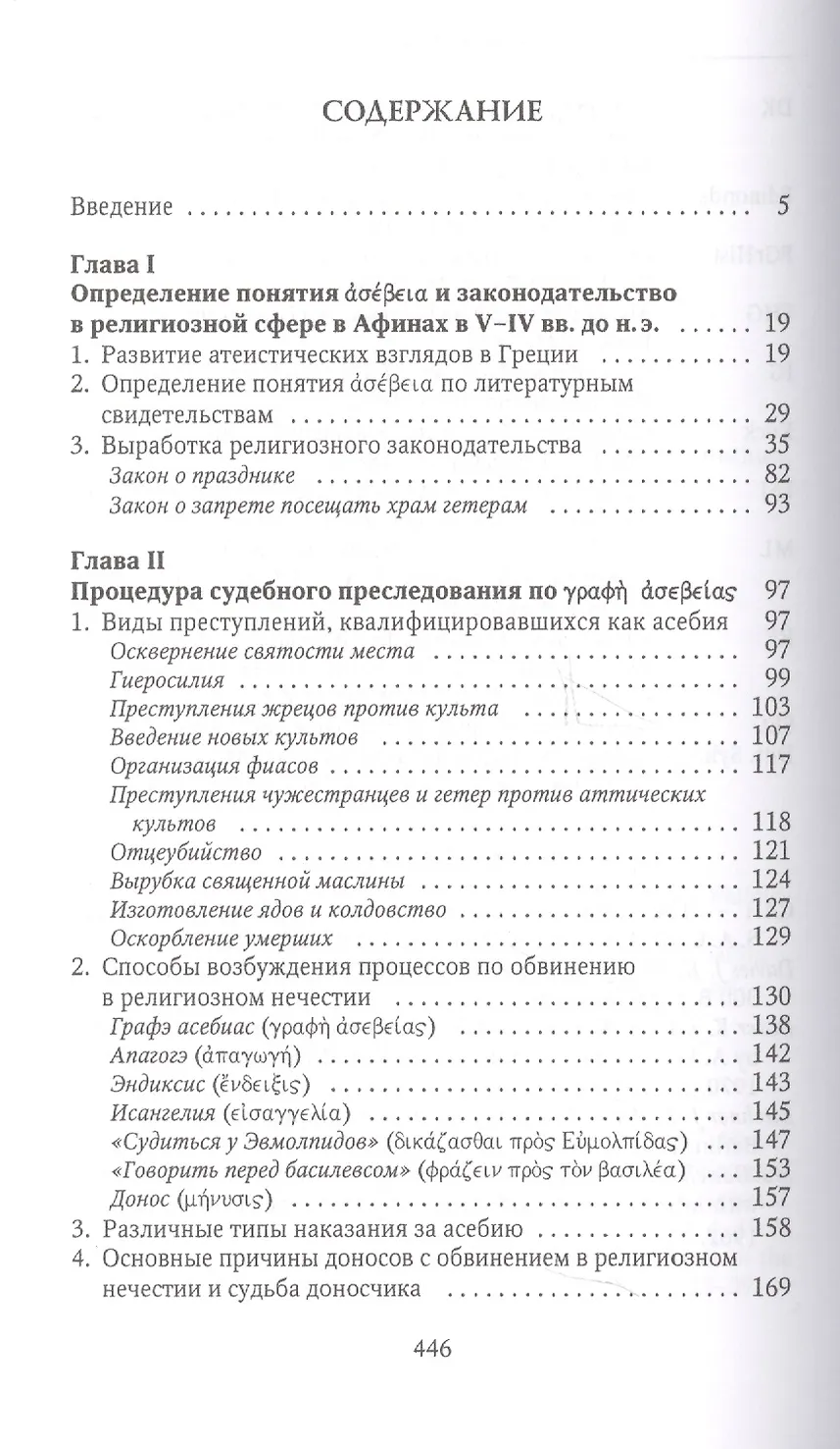 Автор тщательно систематизирует данные античной традиции о сути нечестия (асебии) в понимании древних, о видах проступков, квалифицировавшихся как религиозное нечестие, о способах возбуждения обвинения в подобных случаях, а также рассматривает на отдельных примерах сам ход судебного процесса.