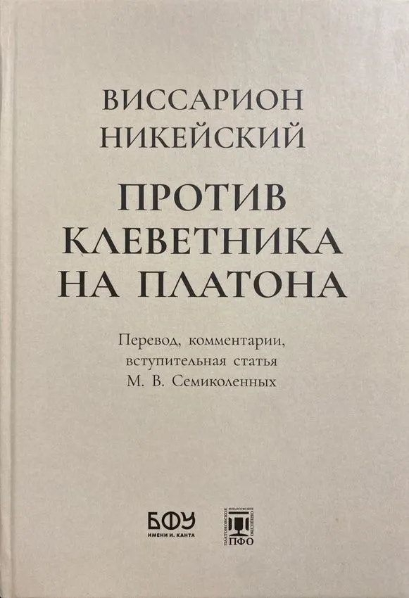 • Книга «Против клеветника на Платона» - автор Виссарион Никейский, твердый переплёт, кол-во страниц - 648, издательство «БФУ им. И. Канта»,  ISBN 978-5-9971-0801-4, 2023 год