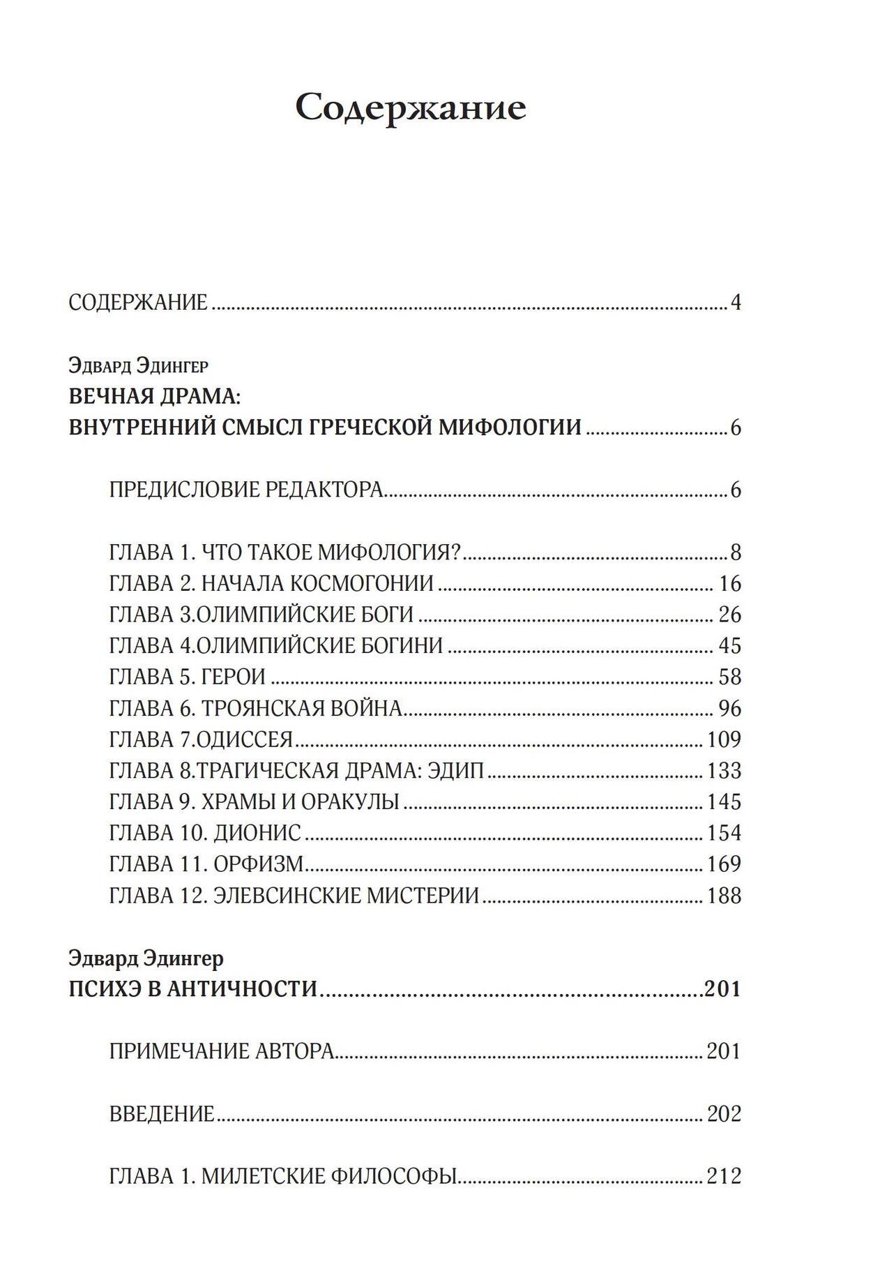 В одной книге Эдингер исследует философскую мысль Греции, в другой - греческую мифологию. Неизменным остаётся одно: та связь, которую Эдингер устанавливает между древней и современной психологией. Как знать, быть может именно античное время только и может помочь нам в нашем самопознании?
