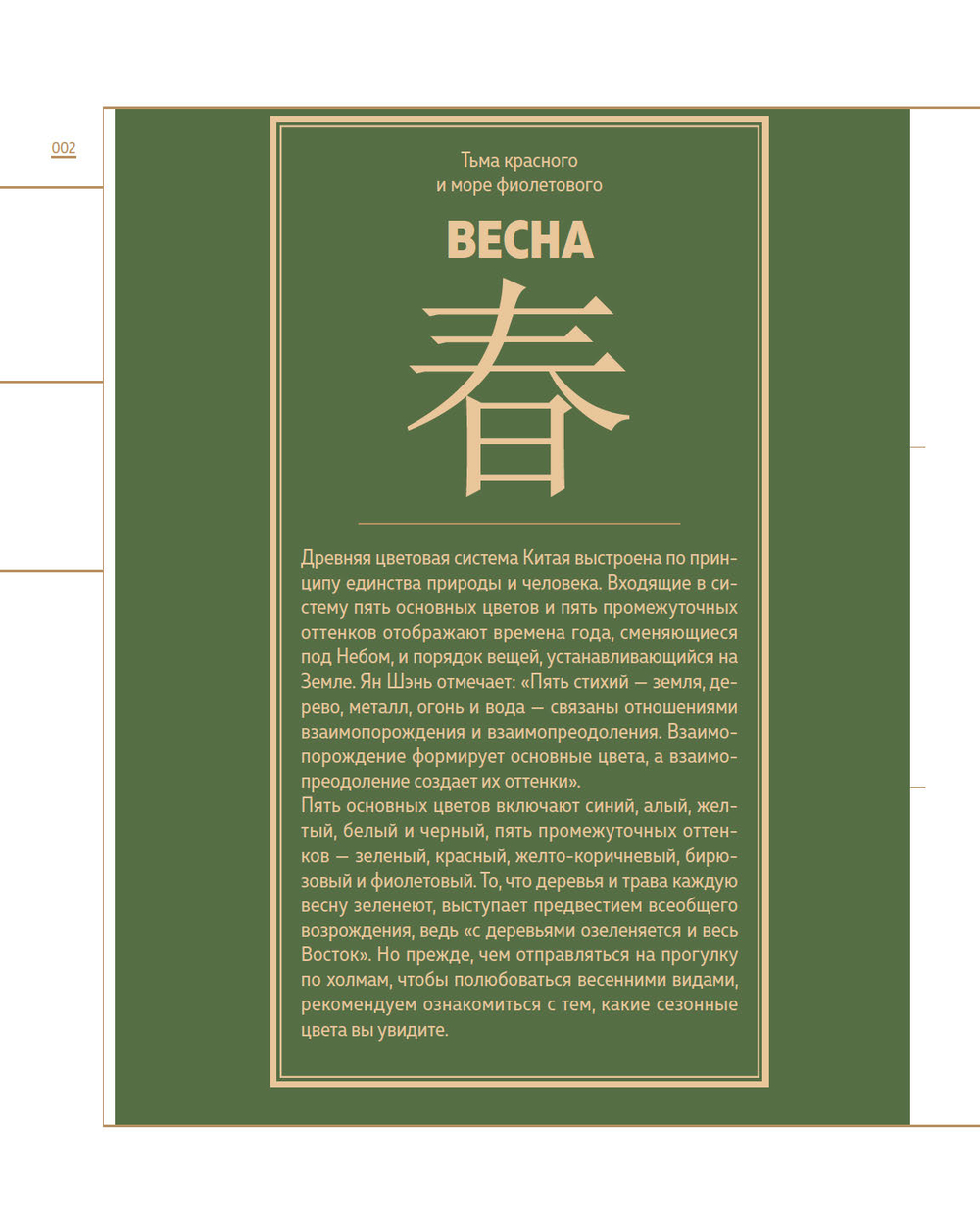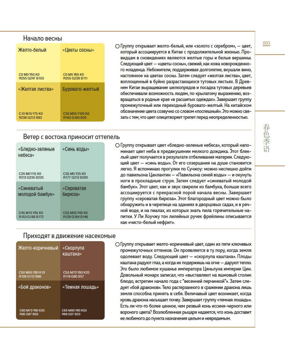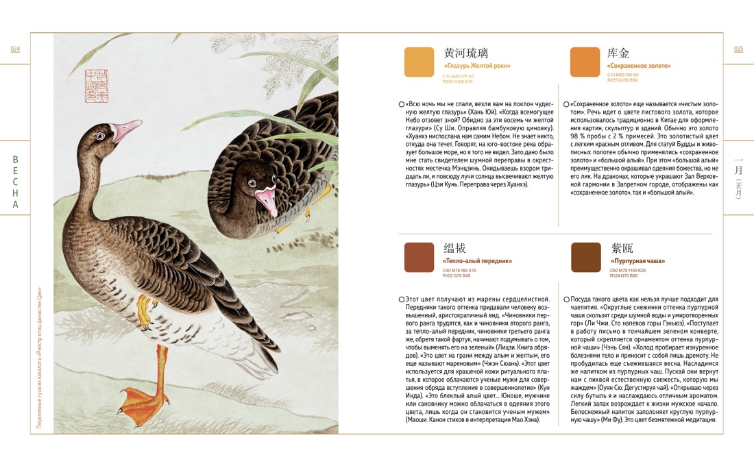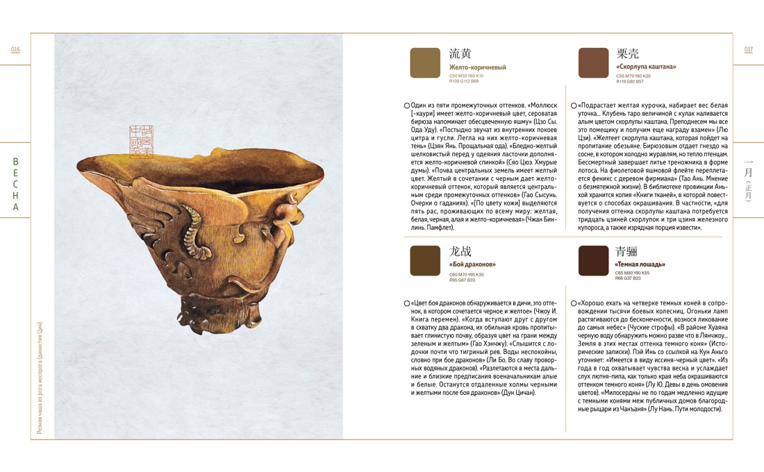 Опираясь на древние тексты и артефакты, культурологи Го Хао и Ли Цзяньмин исследуют историю и символику традиционных цветов страны и подробно объясняют их свойства и значения в прошлом и настоящем китайской культуры.