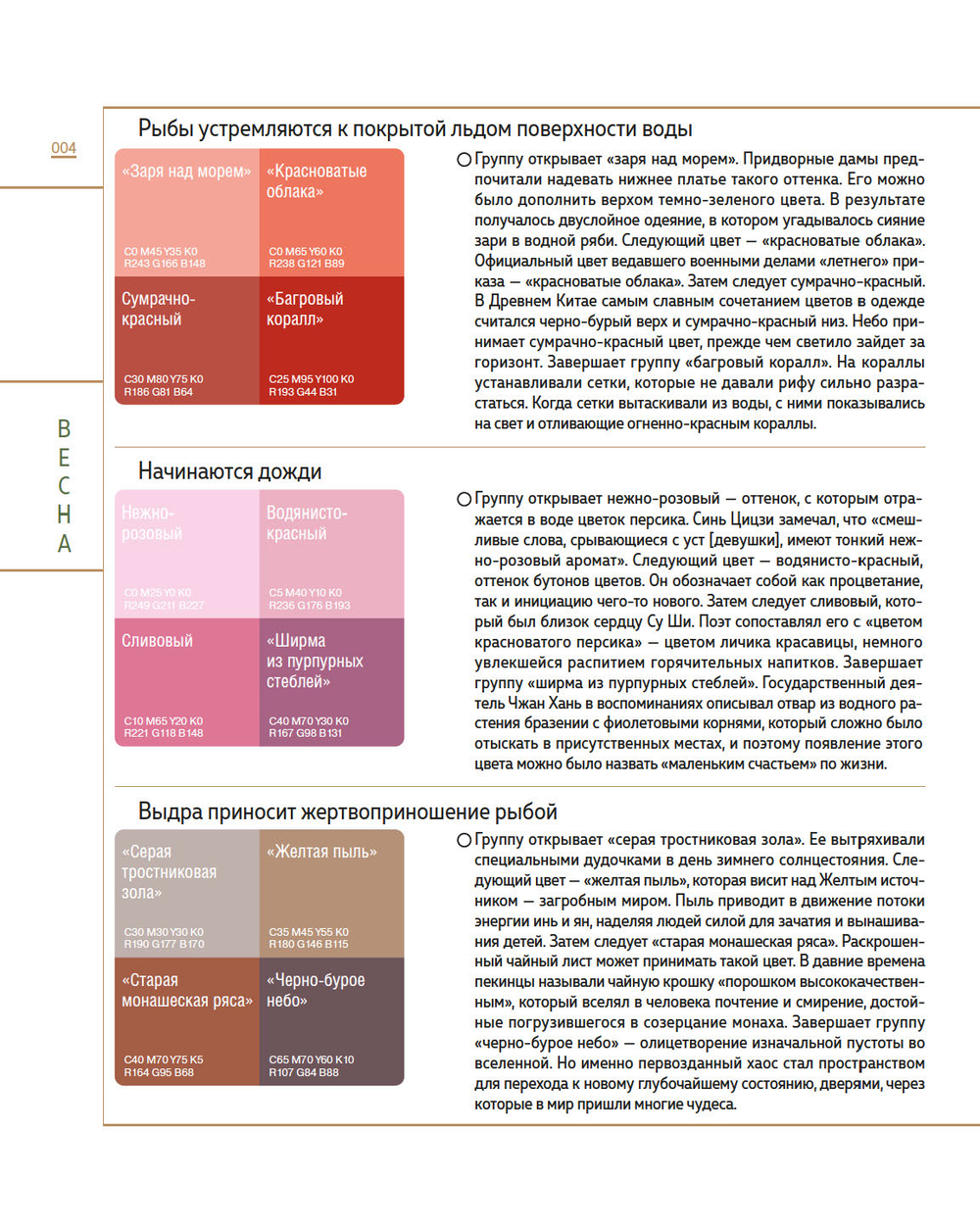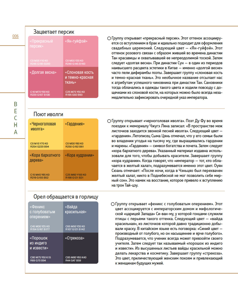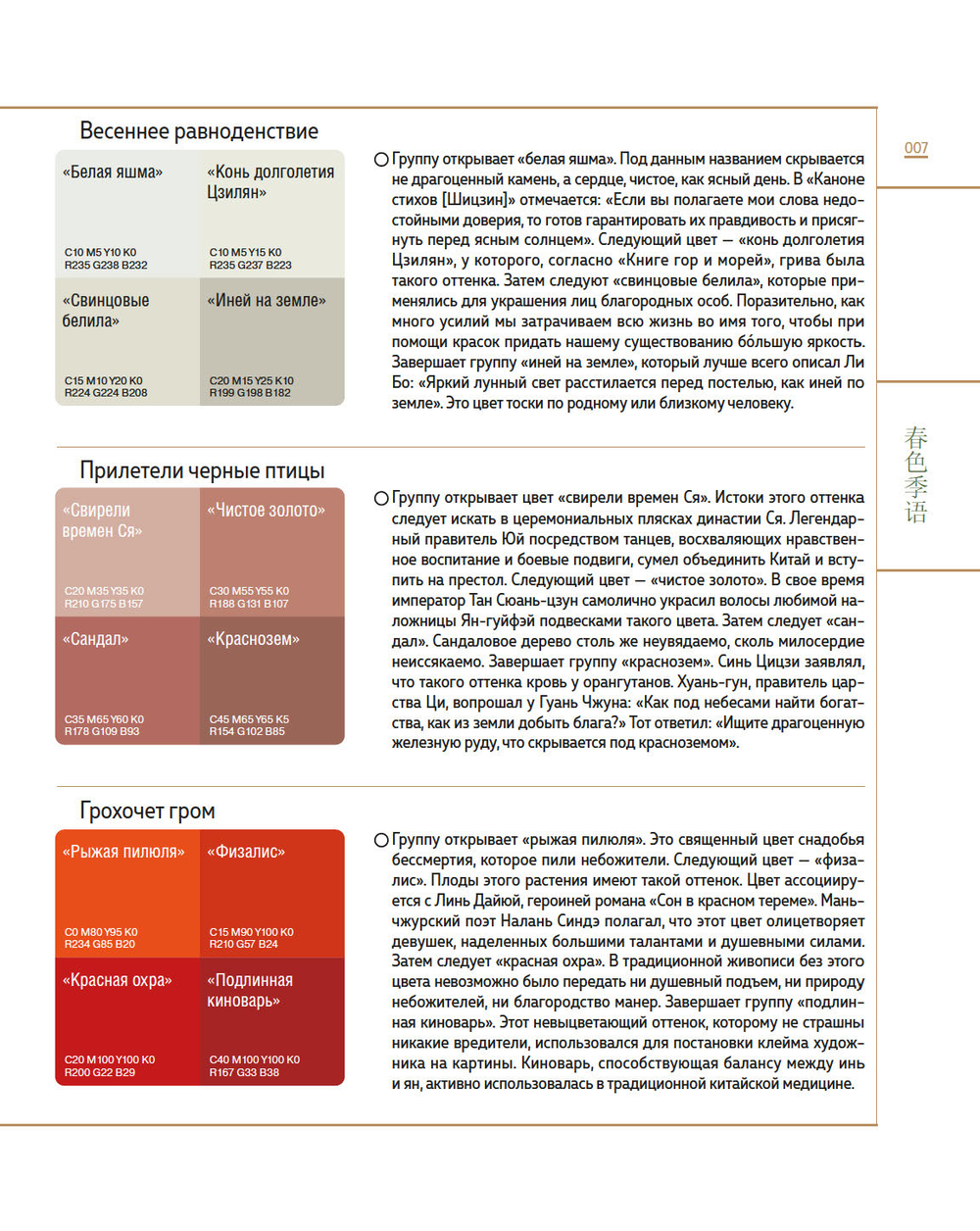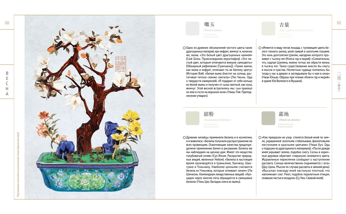 Книга представляет собой исчерпывающую энциклопедию традиционных цветов, применяемых в китайском искусстве и культуре на протяжении веков.