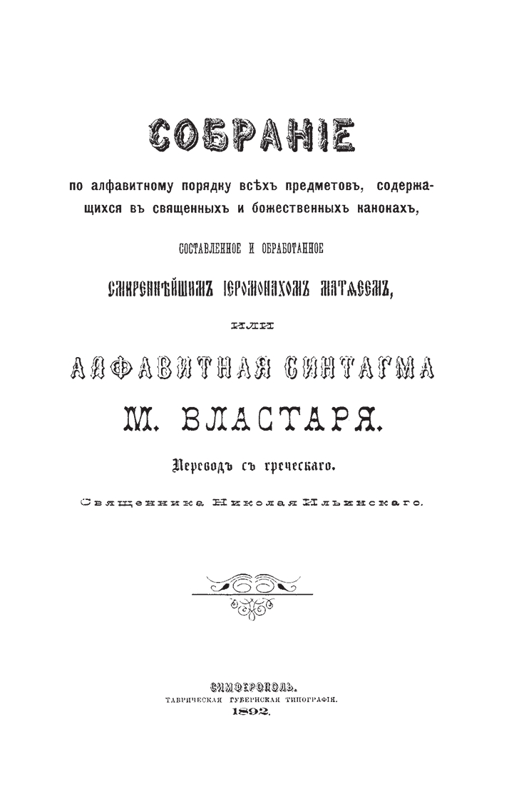 • Книга «Алфавитная синтагма иеромонаха Матфея Властаря» - автор Матфей Властарь иеромонах , твердый переплёт, кол-во страниц - 495, издательство «ИМП»,  ISBN 978-5-907880-36-35-1, 2025 год