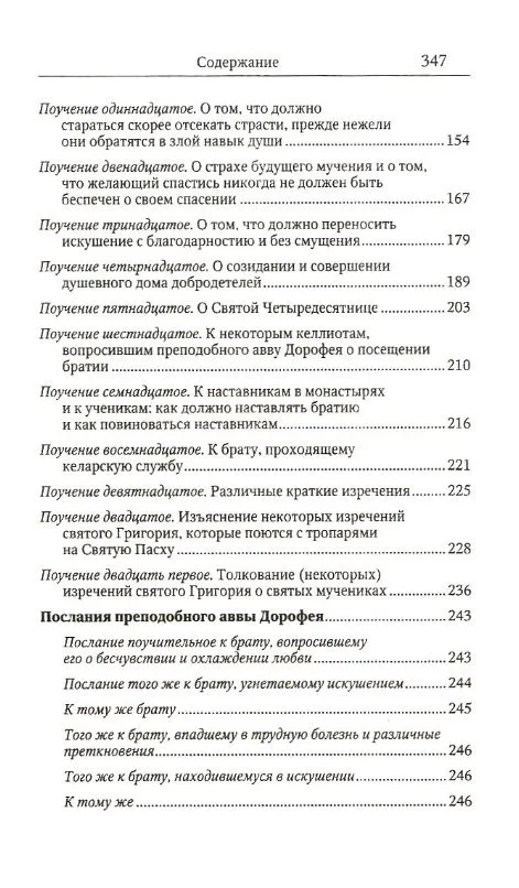 Поучения Дорофея исполнены глубокой духовной мудрости, они раскрывают внутреннюю жизнь христианина, постепенное восхождение его в меру возраста Христова (Еф. 4,13). Автор тонко чувствует состояние человеческой души и подробно анализирует ее движения и помыслы, опираясь при этом на учение святых отцов Церкви: Василия Великого, Григория Богослова и Григория Нисского.