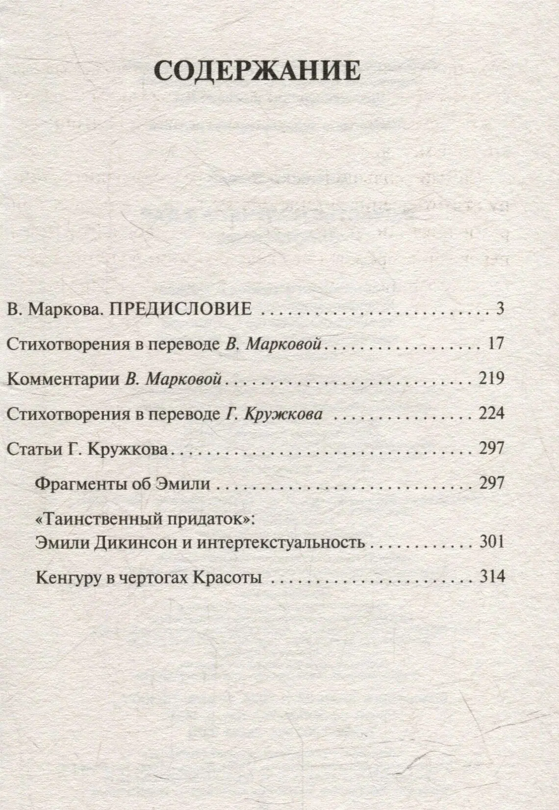 В это издание вошли стихи в переводах Веры Марковой и Григория Кружкова. И как писал Г. Кружков, стихи Дикинсон заслуживают того, чтобы читать их сплошь, удивляться и делать все новые открытия.