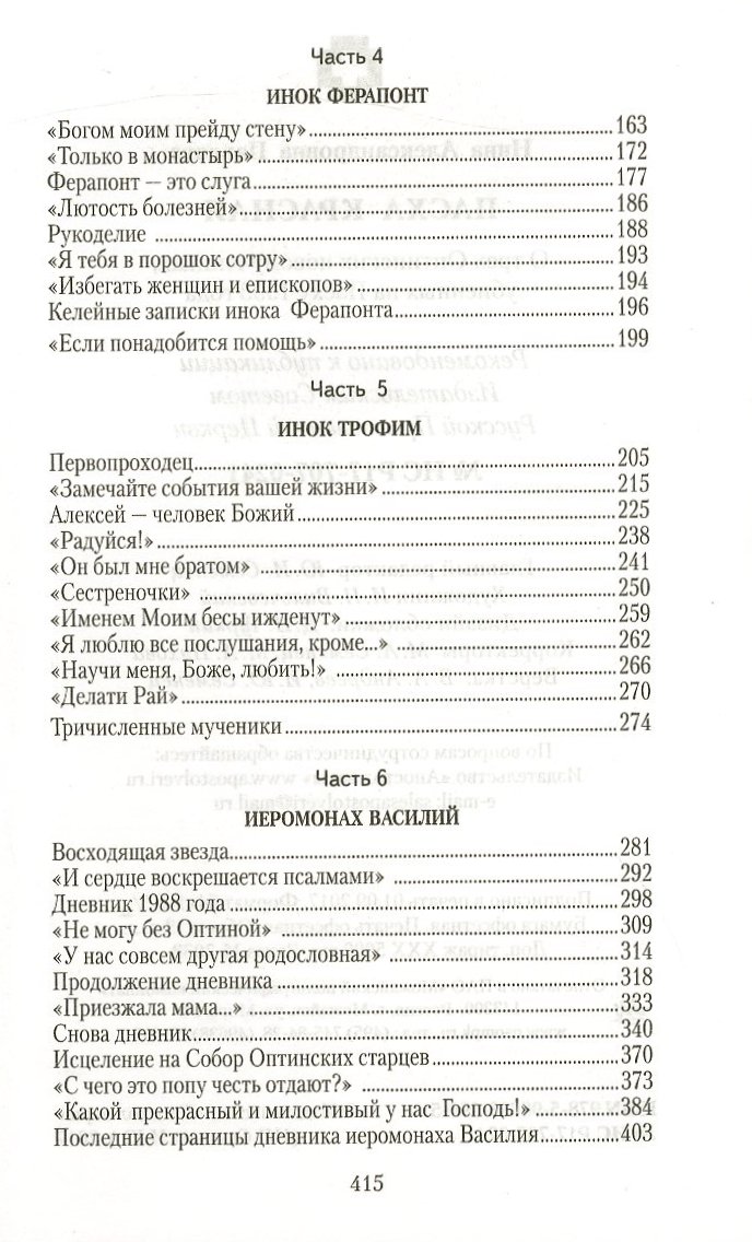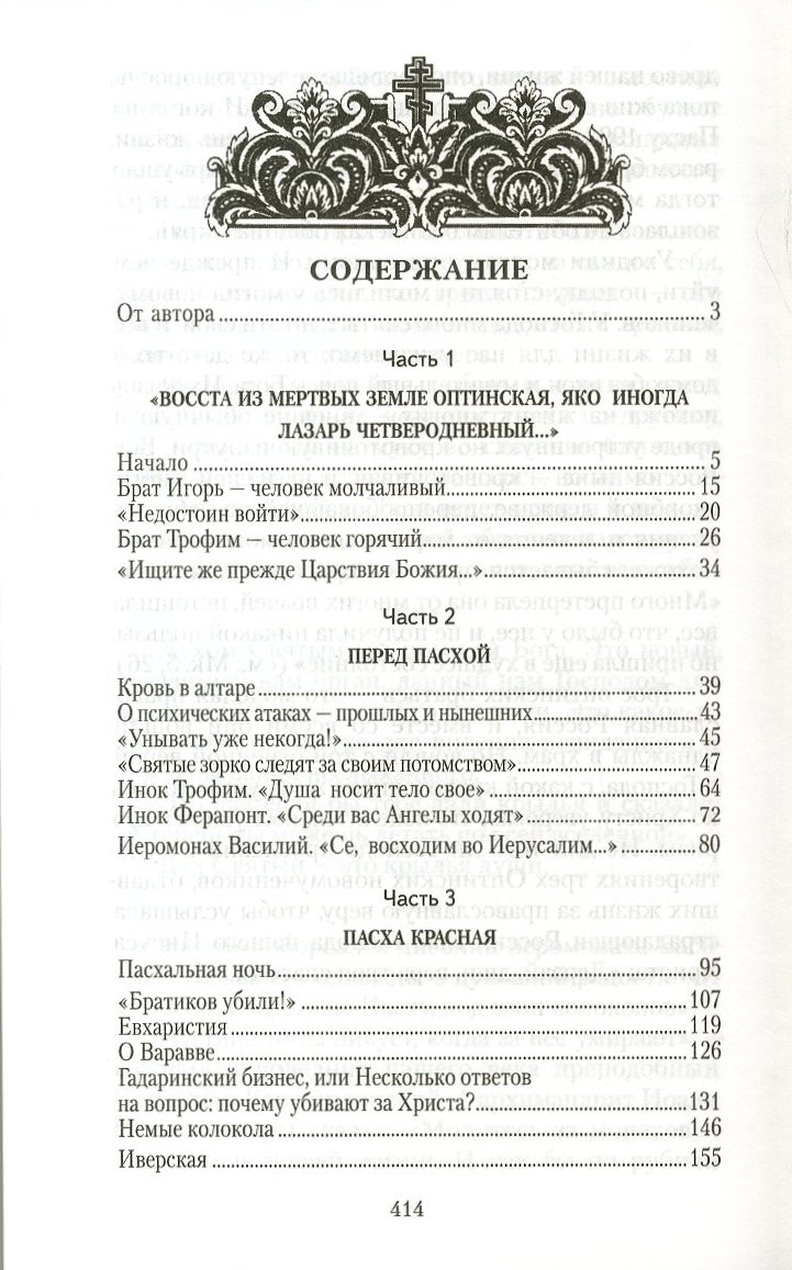 Эта книга — летопись Оптиной пустыни, в ней подробно описывается жизнь трёх подвижников, монахов, убиенных на Пасху 1993 года — иеромонаха Василия, иноков Ферапонта и Трофима.