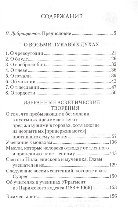 В книге помещены его нравственно-аскетические произведения: "О восьми лукавых духах", "О том, что пребывающие в безмолвии в пустынях преимуществуют пред живущими в городах", "Увещание к монахам", "Мысли, которые человека отводят от тленного и прилепляют к нетленному", "Главы увещательные", "Об учителе и учениках".