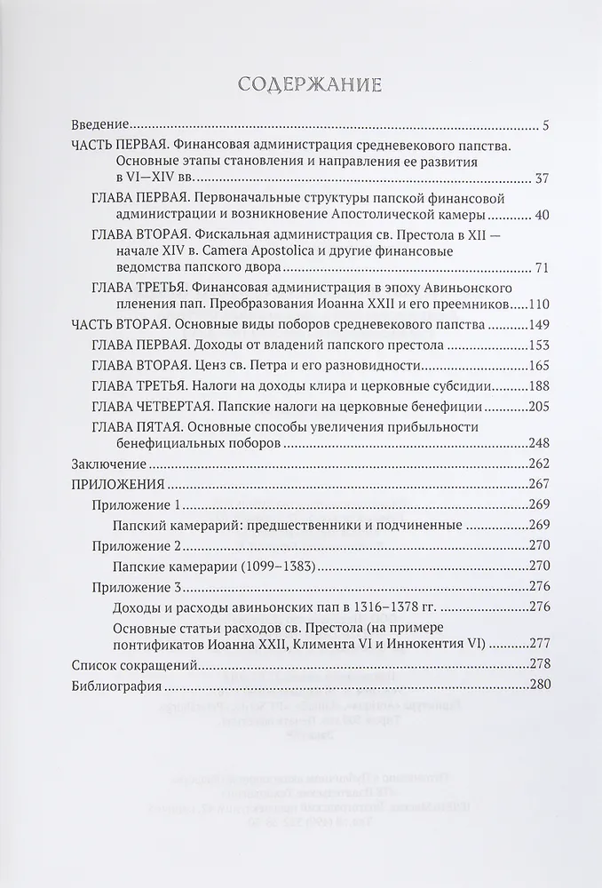 Особое место в монографии уделено периоду Авиньонского пленения пап (1309-1378), ставшему, по мнению большинства современных исследователей, временем наивысшего финансового могущества св. Престола и максимального усиления его главного фискального ведомства - Апостолической камеры (Camera Apostolica). В отсутствие соответствующей русской историографической традиции автор вводит специальную терминологию для обозначения как отдельных финансовых чиновников папского двора, так основных поборов, взимавшихся в пользу папы. Книга также снабжена рядом ценных приложений.