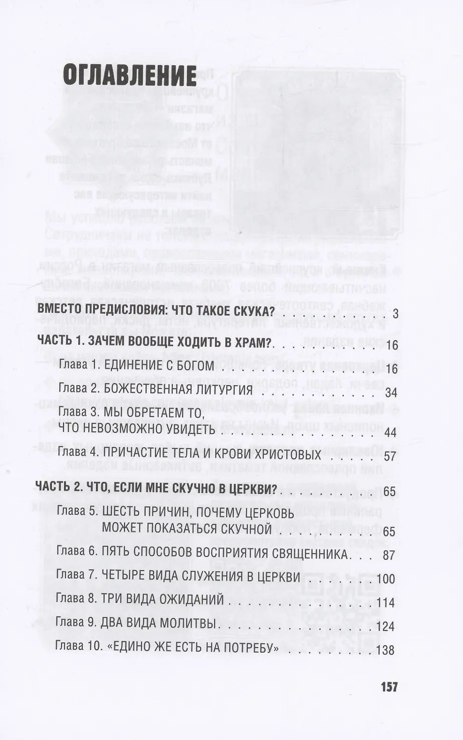 «Тот факт, что нам иногда бывает скучно в церкви, — пишет автор, — указывает на проблему в нас самих, но никак не в Церкви». Основываясь на своем опыте служения и на общении с прихожанами, автор показывает, как можно изменить свое отношение к богослужению, сделать так, чтобы присутствие на Божественной литургии доставляло духовное наслаждение, приносило пользу, воспринималось как радость.