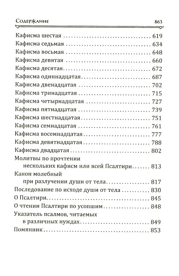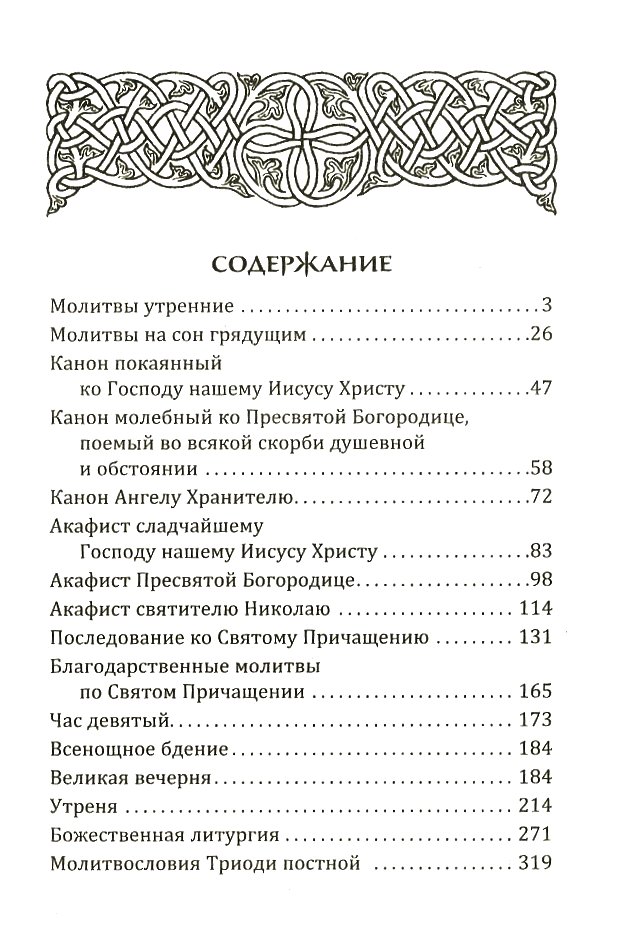 Затем следуют раздельные каноны, акафисты и последование ко Святому Причащению. В книгу также включены все службы суточного богослужебного круга, тропари и кондаки на всю седмицу. Кроме того, в издание вошли Псалтирь и канон молебный при разлучении души от тела.