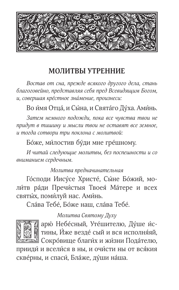 Молитвослов включает молитвы утренние; помянник; молитвы на сон грядущим; каноны: покаянный ко Господу нашему Иисусу Христу, Божией Матери и Ангелу хранителю; акафист Сладчайшему Господу нашему Иисусу Христу; акафист Пресвятой Богородице; последование ко Святому Причащению и благодарственные молитвы по Святом Причащении, а также объяснение, как готовиться ко Святому Причащению; молитвословия Святой Пасхи; тропари и кондаки праздников, с задостойниками их; тропари и кондаки воскресные восьми гласов; молитвы необходимые в разных случаях жизни.