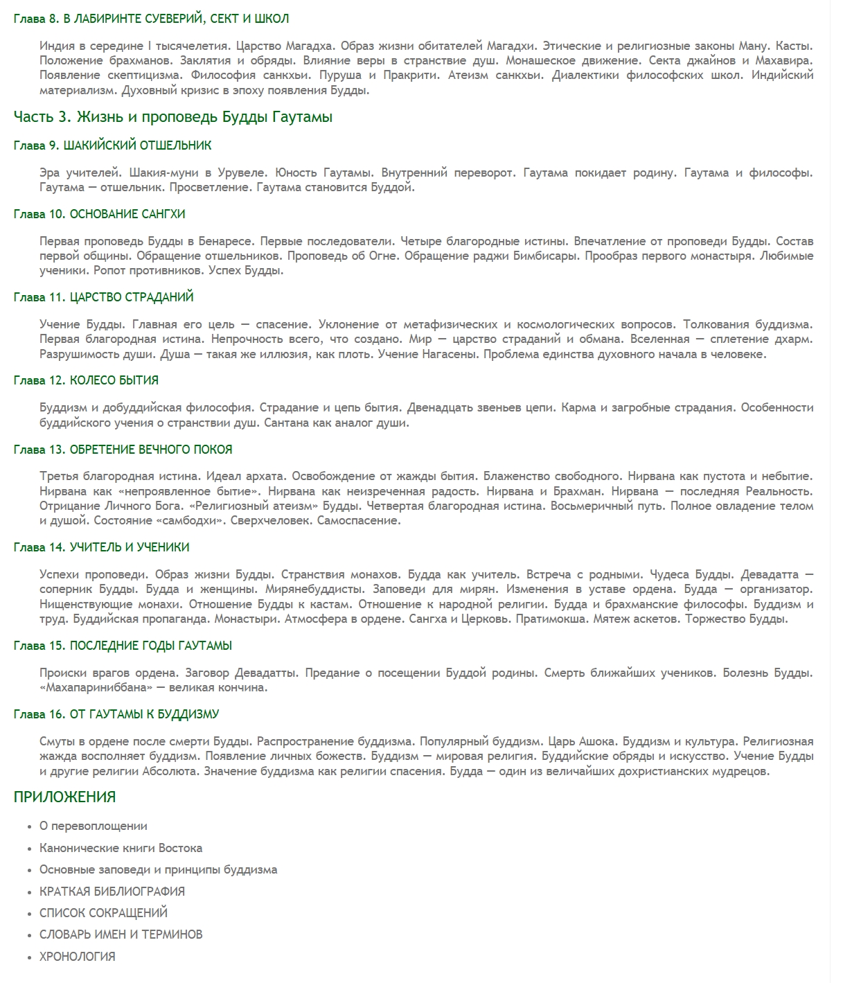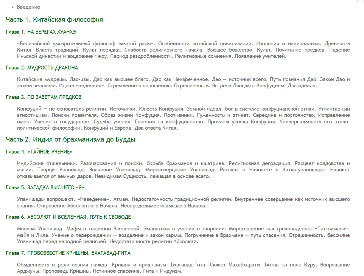 В 1-й её части излагаются учения китайских мудрецов, прежде всего Лао-цзы и Конфуция. Две остальные части посвящены мудрости Индии и прежде всего истории буддизма, в котором с наибольшей для древнего мира силой воплотилась всеобщая жажда спасения.