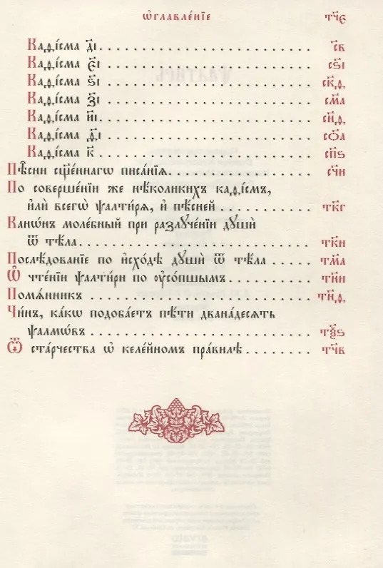 Псалтирь содержит: двадцать кафизм; тропари и молитвы, полагающиеся перед чтением Псалтири и по окончании чтения, а также после каждой кафизмы; Песни Священного Писания; Канон молебный при разлучении души от тела; Последование по исходе души от тела; Помянник; Чин двенадцати псалмов.