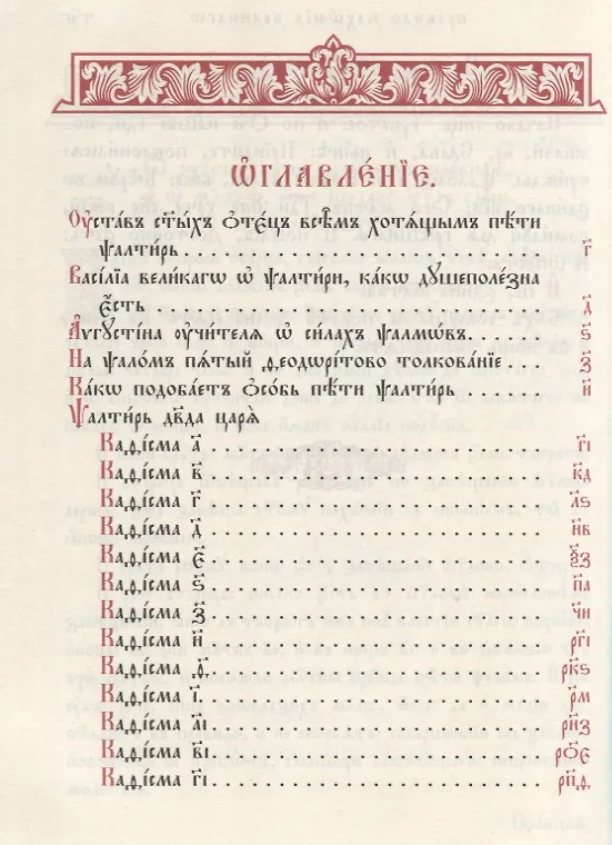 Это издание Псалтири удобно для чтения в храме и дома. Текст напечатан церковнославянским шрифтом «Hirmos», который соответствует рисунку букв синодальных богослужебных книг XIX в. Издание богато украшено традиционными для древнерусских книг прорисями, буквицами и орнаментами. Псалтирь интересно внимательно рассматривать: каждой кафизме предшествует заставка с медальоном, сюжет которого связан с содержанием следующих псалмов.