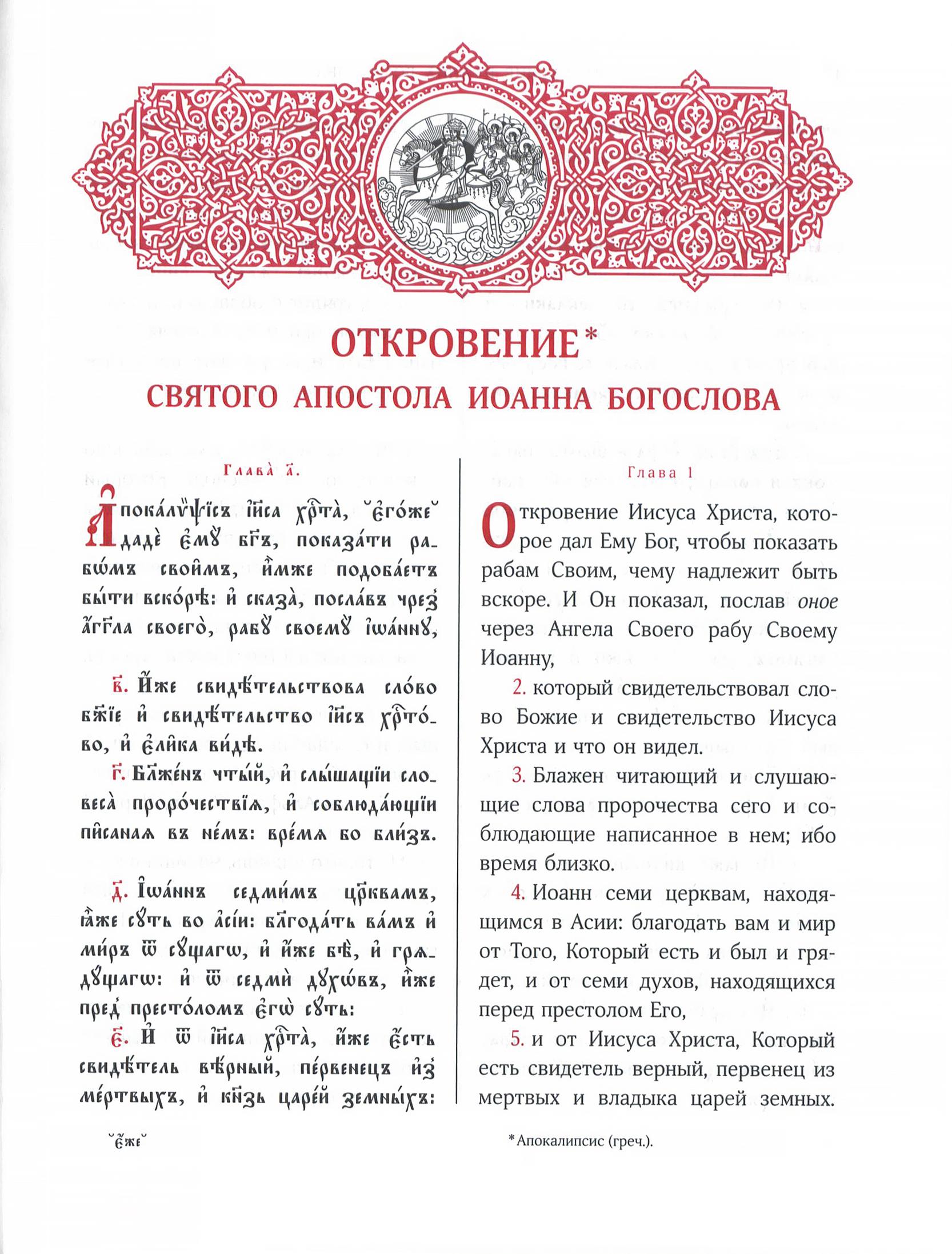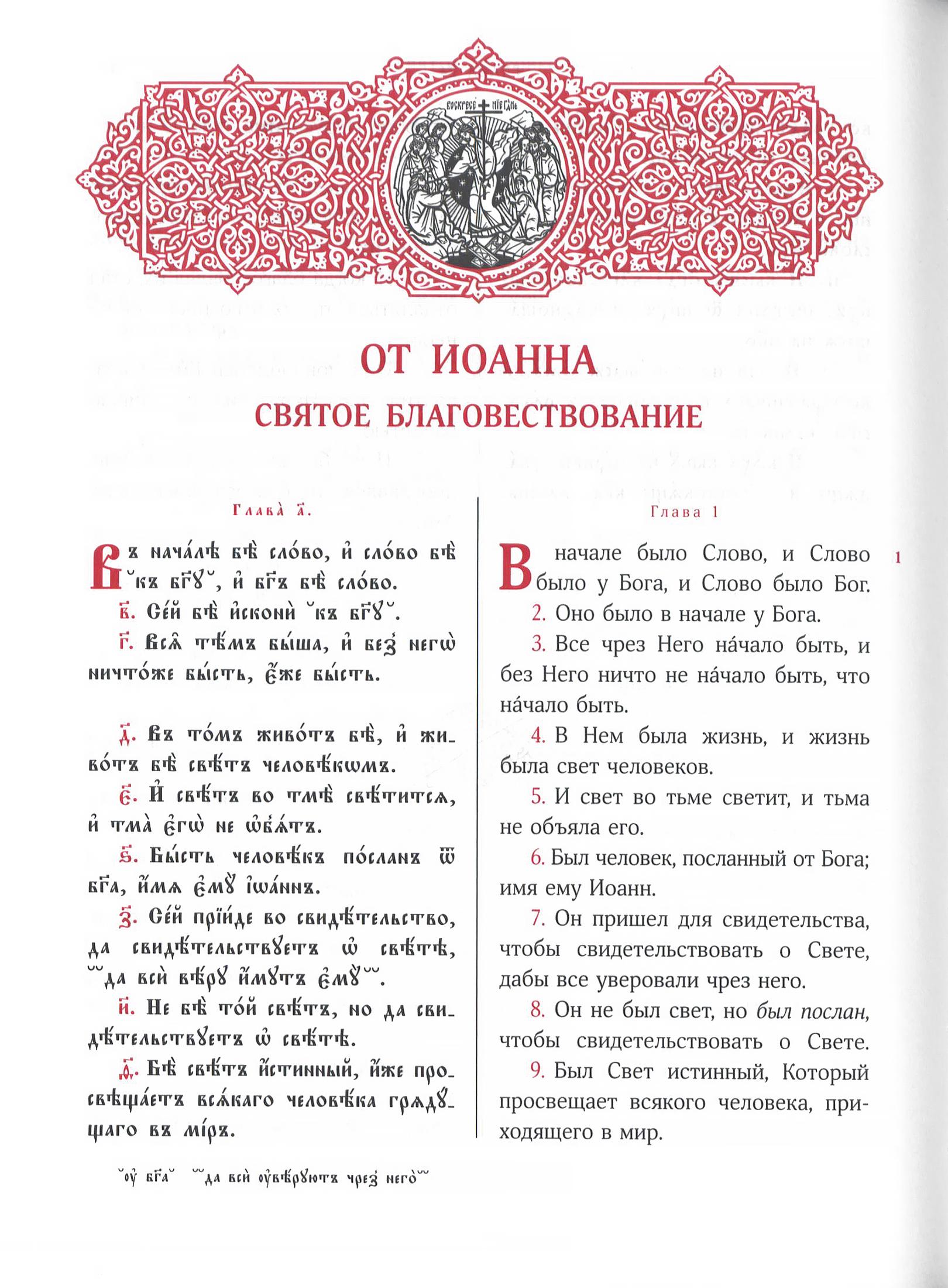 Церковнославянский текст четырех Евангелий и Апостола даётся в богослужебной редакции. Русский текст – это синодальный перевод Нового Завета, впервые опубликованный в 1862 году.