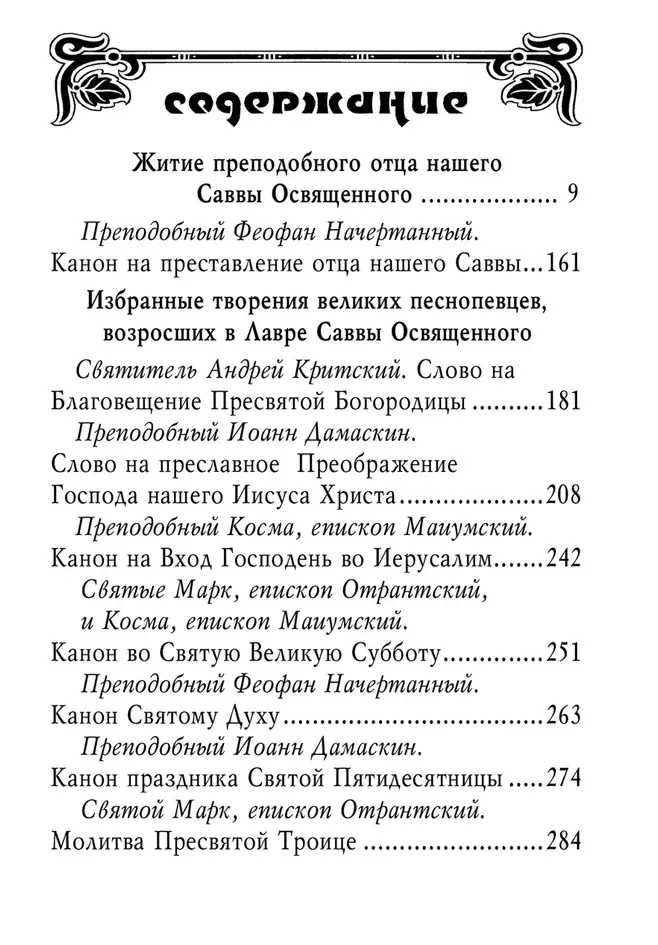 Первая часть этого сборника — обширное жизнеописание святого Саввы Освященного (439-532), в котором представлена бурлящая эпоха того времени: становление монашества, взаимоотношения Церкви и императора, борьба с ересями и, наконец, зарождение устава церковной жизни православного христианина при его присутствии и духовном участии в богослужении. Завершает «Житие» канон преподобному Савве, написанный святым Феофаном Начертанным.