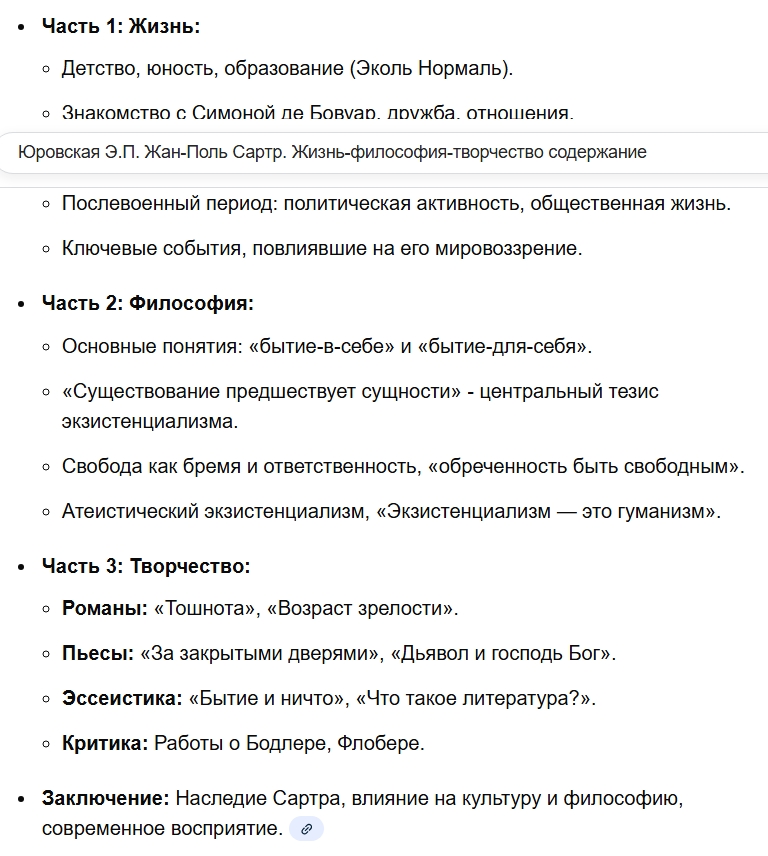 В 1965—1966 годах проходила стажировку в парижском университете Сорбонна, где непосредственно познакомилась с Ж.-П. Сартром, философские взгляды которого и являлись предметом её исследований в аспирантуре. Позднее Эльга Павловна сама отмечала, что она по её же просьбе была приглашена на встречу-консультацию с философом для обсуждения плана и круга проблем, поднятых в её диссертации. Э. П. Юровская продолжала переписку с французским мыслителем до самой его смерти в 1980 году. В монографии «Ж.-П. Сартр. Жизнь — Философия — Творчество» описала его жизненный путь, философию и творчество как части единого целого.АвторISBN5-9676-0045-0ИздательствоГод2006Кол-во страниц128Размеры (мм.)200х138х6Тип бумагиофсетнаяПереплётЯзык -