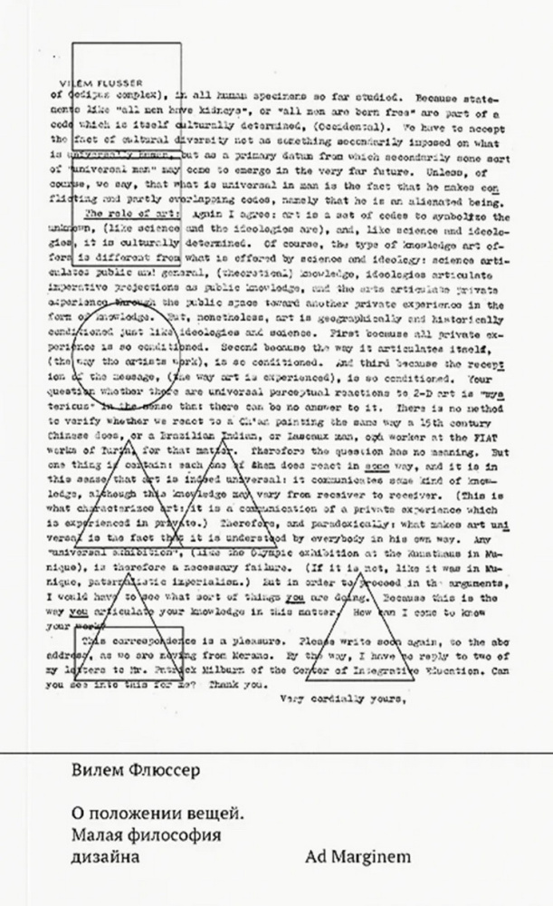 Анализ Флюссера разворачивается как феноменология окружающих нас заурядных вещей и механизмов, дизайна и городской планировки. При этом, встречая наступление новой цифровой эпохи, он обнаруживает, как чистая цифровая форма всё больше угрожает оставить в прошлом вещественность нашего мира.