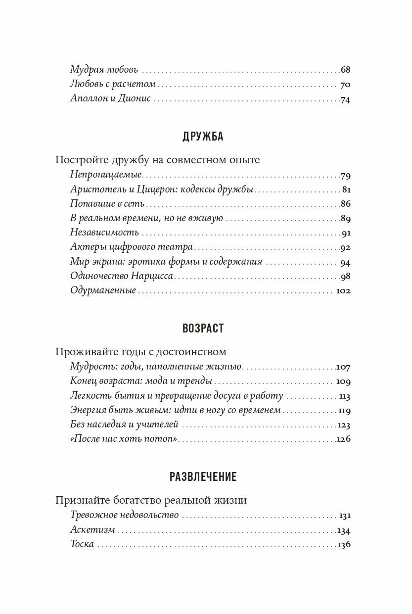 Писатель и философ Хосе Карлос Руис показывает, как философия помогает найти опору в жизни и преодолеть симптомы внутреннего кризиса — тревогу, внутреннюю пустоту, зависимость от развлечений, потерю ориентиров, растерянность и одиночество. Автор предлагает взглянуть критически на такие аспекты современной жизни, как культ активности, стремление к новизне, постоянная нехватка времени и размывание границ между работой и отдыхом, чтобы увидеть, что ваше собственное счастье важнее «идеальной жизни».