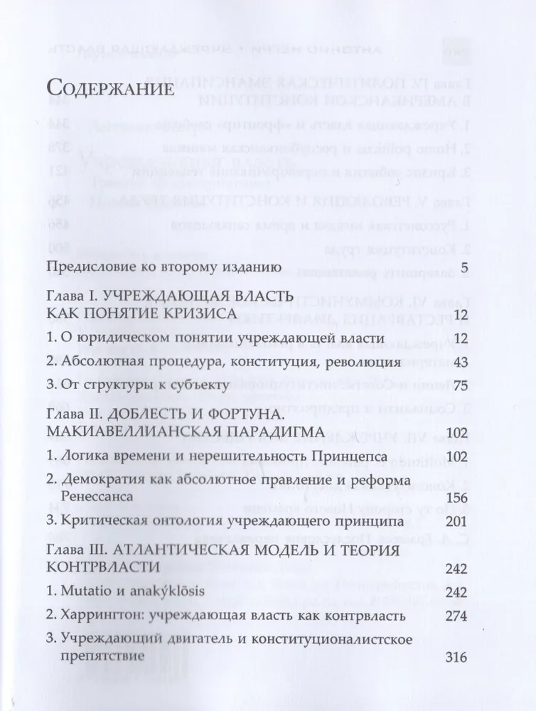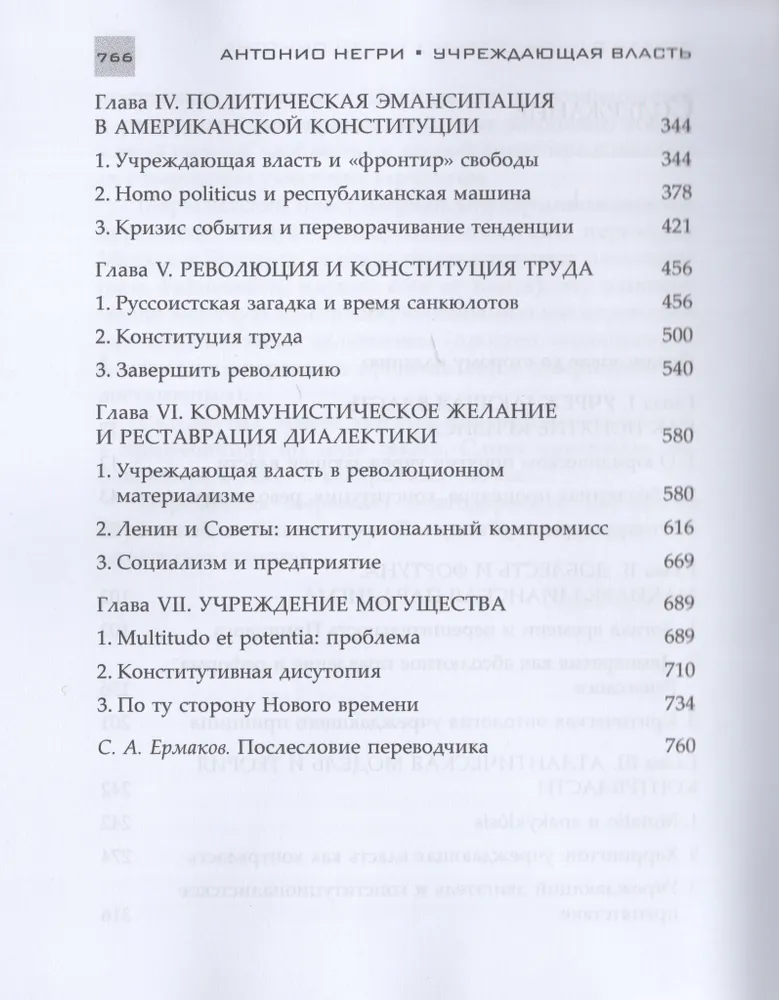 Макиавелли и Харрингтон, отцы-основатели США и Сийес, Руссо и Бёрк, Маркс и Ленин, Шмитт и Кельзен — вот лишь часть авторов, чьи работы Негри прочитывает заново, задавшись вопросом об учреждающей власти. И если одни хотят заключить ее в фиксированные формы юридического порядка, основанием которого учреждающая власть является, то другие демонстрируют ее неудержимость, способность к разрушению и созиданию, радикальному обновлению и переоснованию.