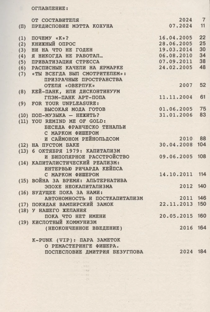 Из огромного архива Фишера, в том числе и неопубликованного в печати, мы отобрали эссе, интернет-посты и интервью, которые обращаются к всеобщему ощущению ненужности, депрессии, невозможности и в то же время горячему желанию фундаментальных перемен, а также сопровождающей эти чувства поп-культуре.