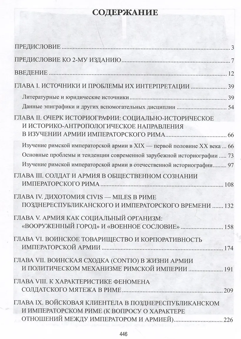На основе широкого круга литературных и документальных источников рассматривается морально-психологическое, аксиологическое и практическое значение традиций воинского товарищества и дисциплины, анализируются представления, связанные с социально-политическими и моральными качествами воинов, воинскими доблестями, честью и славой, знаками отличия и военной карьерой, раскрывается взаимосвязь римского воинского этоса и армейской религии. Исследуются также механизмы и формы участия армии в политических процессах, взаимоотношения императора и войска.
