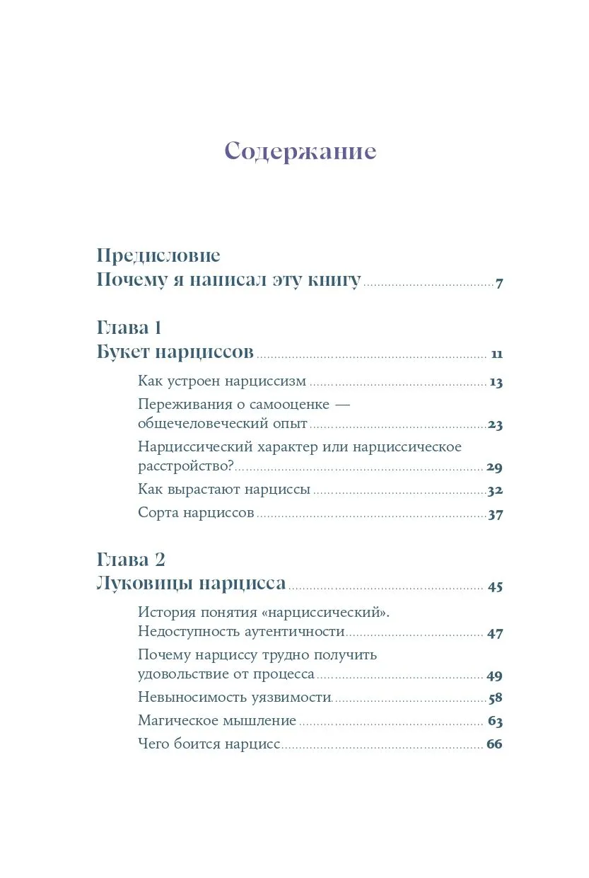 Изучается своеобразие нарциссов в самых разных проявлениях, детально рассматриваются их основные особенности и черты, такие как стыд, высокомерие, гиперконтроль, скука, страх перед оценками других, боязнь отвержения, неспособность сближения, эмоциональная холодность и т. д., анализируется отличие нарциссизма от других расстройств психики, в частности от биполярного расстройства.