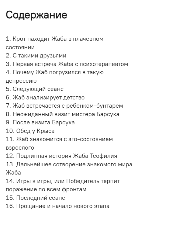 Вместе с главным героем книги Жабом, внезапно впавшим в депрессию, ты познакомишься с мудрым психотерапевтом Цаплей и оглянуться не успеешь, как пройдешь десять сеансов психотерапии. На каждом сеансе тебя ждут новые открытия о собственных чувствах, мыслях и эмоциях. Вместе с забавными героями ты научишься подвергать свои переживания анализу и разберешься, какую роль ты играешь чаще: Родителя, Взрослого или Ребенка?